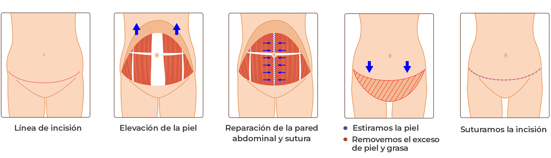 Durante la cirugía, el cirujano reacomoda y sutura los músculos abdominales separados, afinando la cintura y mejorando la firmeza del abdomen. Luego se retira el exceso de piel y grasa del área inferior, y en ocasiones se combina con lipoescultura para definir mejor la cintura o eliminar grasa lateral.